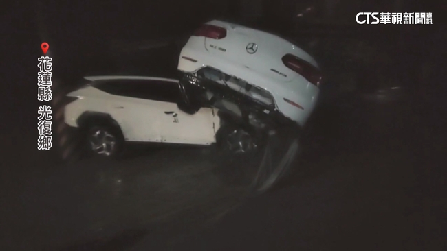 銀色轎車車頭朝地,後車輪直接壓在路邊的機車上,道路上的汽機車,因為大水推擠而堆疊,其中不乏百萬名車,車主看到心都碎了。事情回到23日下午,馬太鞍溪堰塞湖溢流,猛烈大水全都沖進光復鄉,停在路邊的車輛,被洪水沖走,撞成一團。