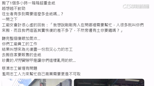 志工發文控訴,工廠業者濫用志工人力,文章寫下,放假去救災,被分配到金紙工廠,搬了一個多小時超重金紙,越想越不對,往生者有需要這麼多金紙嗎?女會計回人很多就叫你們來搬,我們這區其實恢復差不多了,不然旁邊有土妳要鏟嗎?志工聽完又氣又傻眼。