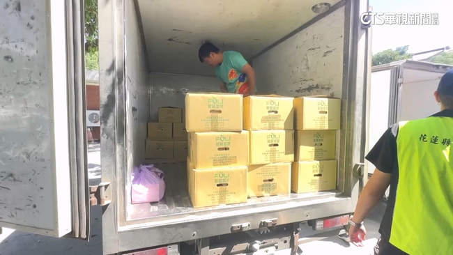 志工說:「16箱,上這台車,16,(16箱唷),對。」貨車上一箱一箱,裡面裝的都是熱騰騰的便當,志工說:「傳,拿上來,謝謝,一個隨車,今天300(個),另外一個單位100。」這些便當有玉溪農會富里農會,還有遠從吉安鄉的團膳業者,大家手腳很快接龍,要趕在中午時間送出去。