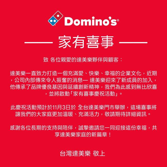 怎料稍早,競爭對手「達美樂」也發文表示,公司內部近日傳來令人振奮的消息,「達美樂迎來了新成員的加入,他傳承了品牌優良基因與延續創新精神,我們為此感到無比欣喜,並將啟動家有喜事慶祝活動,預計於11月3日在全台門市舉辦,這場喜事將讓我們的大家庭更加溫暖、充滿活力,敬請期待詳細資訊」。