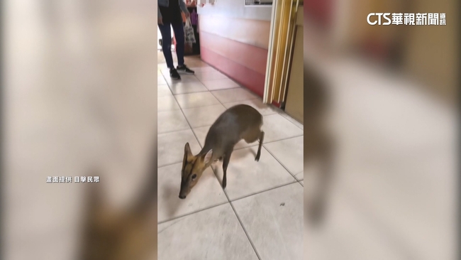 早餐店裡突然來了位不速之客,小小山羌從櫃檯竄到門口,腳下不斷打滑似乎有些驚慌,在店裡頭跑來跑去,店內監視器也記錄下,這隻山羌進進出出的模樣,沒想到來用餐會遇見動物訪客,一旁的客人也拿出手機拍攝。