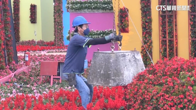 鳳凰颱風逐漸逼近,全台各地都在進行防颱準備,台中花毯節開園20年來,第一次面臨颱風來襲,主辦單位如臨大敵,因為園區內許多賞花的設施,都是臨時搭建,就怕被吹壞了,工作人員忙著將一條條的鋼索,鎖緊固定在鐵架與看板上面,再用鉚釘釘緊在地面上,下午4點半關園,遊客離場,大型吊車進駐到園區,把石墩吊了進來,加固相關的設施。
