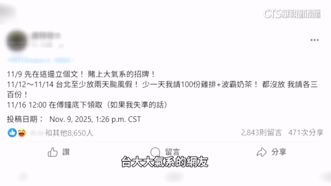 鳳凰颱風來勢洶洶,今(11)日將逐漸北轉往台灣逼近,民眾關心是否有機會放颱風假?一名號稱台大大氣系的網友發出祭品文,預測台北市在明(12)日到14日期間,至少會有2天放颱風假,少一天假就請100份的雞排加珍奶,引發熱烈迴響;對此氣象專家表示,週三開始預計中南部會有放假的機率,北部地區則還須官方評估,一切還是必須多方考量。