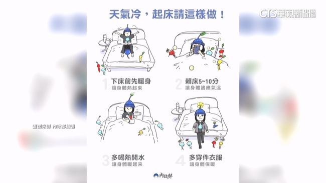 對此,內政部分享了:起床4步驟,包含下床前先暖身、賴床5~10分鐘、喝口熱水、多穿件衣服等,以免血管突然劇烈收縮,發生意外。