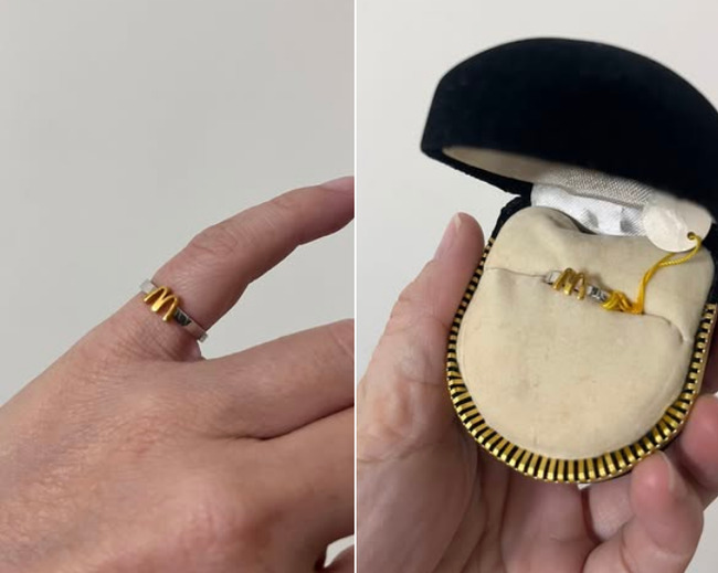 一名網友在臉書社團「迷你廢物俱樂部」貼出麥當勞Logo的戒指照,表示「30年前的麥當勞,做滿一年的員工會送麥當勞Logo戒指,還用很美的盒子裝!整個高級感」。