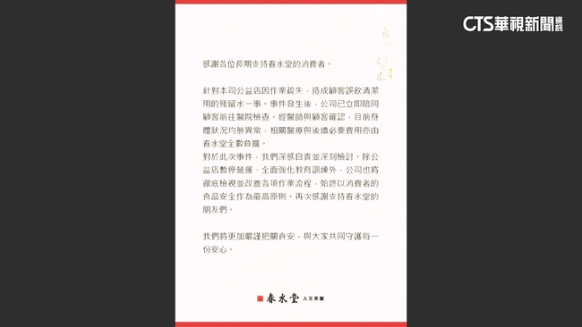 知名連鎖茶飲店春水堂台中公益店發生食安事件,回到現場拉起鐵門,貼上公告,寫下進行內部整修與教育訓練,用餐請到其他店。業者發出聲明致歉,因為作業疏失,造成顧客誤飲清用殘留水。
