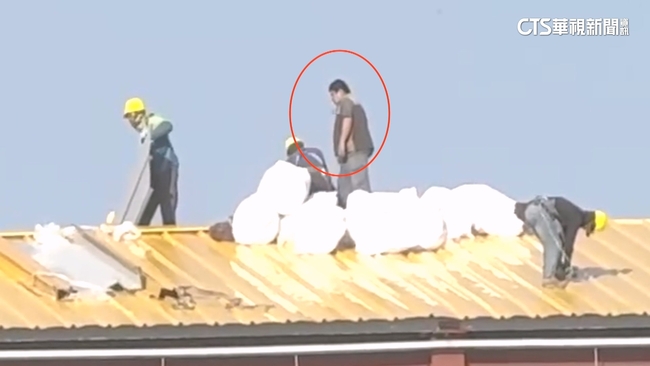 工人實施高空作業,在屋頂上來回穿梭,其中一名工人還沒戴安全帽,但更誇張的事,這群工人身上疑似都沒有綁安全繩索,目擊民眾說:「真的不怕死。」目擊民眾在現場看的是膽戰心驚,因為這群工人站的地方將近5層樓高。