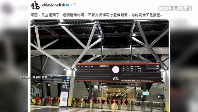 來自嘉義的立委蔡易餘,就在臉書上PO文分享,說搭高鐵不小心搭錯到台南,還是末班車所以沒車北上,並懊惱寫下這個建築物,不管妳長得再怎麼像嘉義,妳終究就不是嘉義,高鐵台南站民眾說:「就是,對,整體都滿像的。」高鐵台南站民眾說:「還滿相近的,如果沒看招牌的話,就是沒有看牌子,可能認不出來這樣子。」