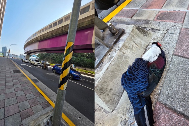 柳丁哥哥發文表示,前天早上行經中和要去買東西,下橋時眼角撇見疑似動物躺在人行道旁,讓很常遇到路殺動物的他,本能的趕緊停下查看,一開始只覺得這隻鳥好大、羽毛好美,但仔細一瞧這羽毛的顏色,「不對啊!該不會是藍腹鷴吧?」指出這裡算是市區,雖然左側遠方有安坑山區,但距離也不算近,以海拔來說,藍腹鷴怎麼可能出現在這。