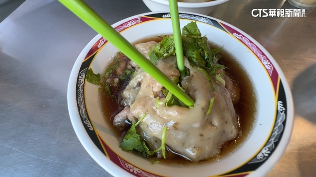 肉圓蒸熟後放入陶鍋中,連同滷汁一起浸泡,讓外皮吸飽滷汁滲透進去,當客人上門點餐,滷的肉圓連同醬汁一起撈入碗中,先蒸後滷的做法,讓肉圓皮Q軟嫩口感香濃,顧客說:「第一次吃到滷的,很特別,好吃,入味,粉漿皮啊,沾附它的滷汁,然後吃起來就鹹香。」