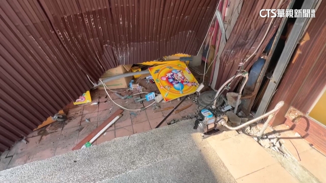 飲料店員工VS.記者:「都壞掉了然後那個馬達都飛到隔壁了,損失不少喔,不少這邊估計,公司估計起來大概要50萬跑不掉。」馬達、水管遭受波及,連接兩間店面的鐵皮全都凹陷,娃娃機店更是慘重,玻璃碎片掉滿地,機台毀損,只能先將內部獎品放置大型垃圾袋內。