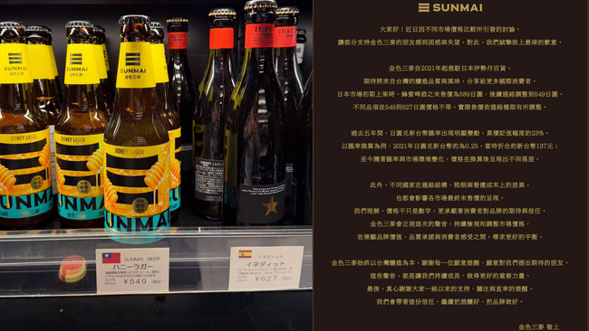 台灣精釀啤酒品牌「SUNMAI金色三麥」執行長葉冠廷日前在社群中分享,人氣品項蜂蜜啤酒在日本伊勢丹上架,而網友發現該品項在台灣賣125元,但在日本售價為549日圓(約台幣110左右)。消息曝光後引發熱烈討論,葉冠廷也在貼文中解釋原因,但仍有不少網友不埋單,對此,葉冠廷再次發出聲明表示「可以理解大家會覺得台灣品牌在原產地應該更優惠,未來我們也會重新檢討各市場的定價策略。」但仍然無法止住網友們的不滿。