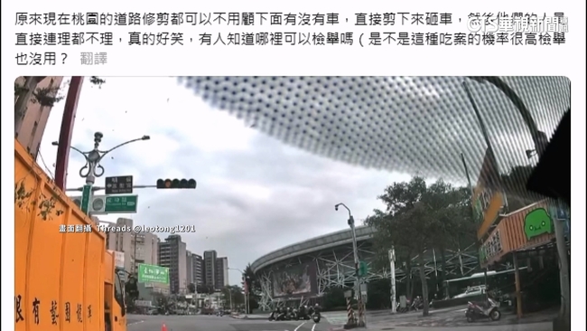 駕駛無奈表示,施作人員沒有顧及下方有無來車,上面的修剪人員,也沒有注意枝葉落下的位置,砸到車子後,對方只是把枝葉移開,就算駕駛喊砸到車了,他們也不理會,對此桃園區公所出面解釋,施工期間廠商有配置交維人員,及封閉一個車道才進行施工。