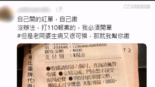 社群貼出罰單的照片,記載違規停車的時間地點,開罰的法源,開單的是派出所的警員,但貼文強調,「自己開的紅單自己繳」,理由是「老阿婆生病又很可憐那我就幫你繳」,當地民眾說:「關注老人,警察有良心啦哈哈,當然要按讚啦,不錯啊。」