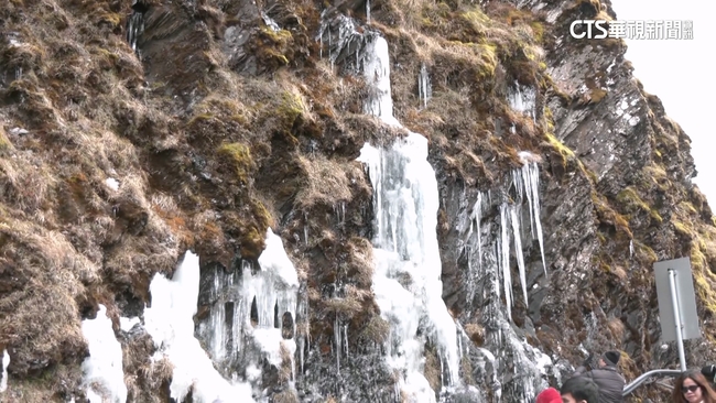 民眾說:「很冷,超級冷,就愛美不怕流鼻水。」民眾說:「好冷喔,快被凍僵了。」而山上往松雪樓的道路,山壁還形成壯觀的冰柱,吸引許多遊客拍照錄影。