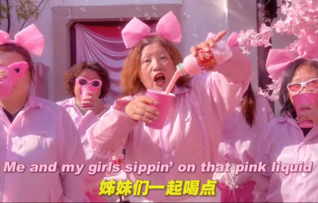 桂香阿姨近日上傳一支1分鐘的短片,一群穿著粉色服裝,手持粉色杯子倒入粉色液體,音樂一出,桂香阿姨就唱著「我和姊妹們一起喝點粉色的液體」、「一種甜甜的液體」、「這是低糖的液體」、「這是草莓的液體」,搭配滑稽舞步,瞬間引發網友熱議,紛紛留言「改白色呢」、「不能只有我看到,全轉發」、「很洗腦」、「團體名稱:我的阿嬤時代」、「還怪好聽的哈哈」、「突然想用我奶奶的口音唱歌了」。