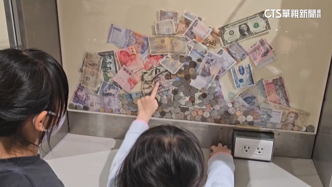 機場旅客站在充電站前,幫手機充飽電力,不過仔細看眼前這排透明壓克力,怎麼特別吸睛,裡面收藏的都是來自不同國家的鈔票及硬幣,不僅有新台幣越南盾,美金還有汶萊元,各式各樣鈔票款式大剌剌擺在眼前,不說還以為是另類許願池,奇特場景也讓路過旅客忍不住多看幾眼。