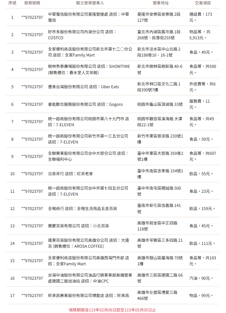 114年11-12月統一發票中獎號碼於1月25日開獎,特別獎號碼為「97023797」,特獎號碼為「00507588」,財政部今(4)日公布特別獎、特獎中獎清冊,同時也提醒領獎期間自115年02月06日起至115年05月05日止。