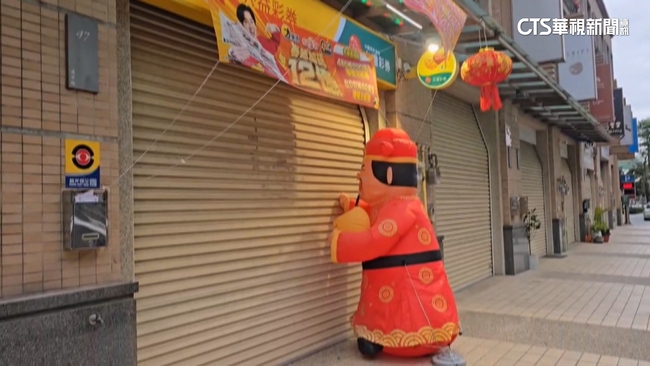 這畫面可以說是財神爺狂敲門!新竹市一家彩券行,網友直擊,財神爺人偶氣球,就鐵捲門外被風吹,看起來像在猛力敲門。