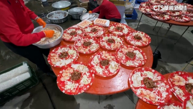 一邊攪拌一邊倒入海鮮配料,滿滿一大鍋魚翅羹慢火熬煮,金黃色的烏魚子切成片狀好入口,一顆顆新鮮鮑魚擺上冷盤,象徵年年有餘的鮮魚,搭配破布子清蒸提出鮮味,一旁還有油飯正在準備,看看手機時間凌晨2點17分,業者挑燈夜戰,動員30幾人分工合作,有的幫忙擺盤,有人負責料理,數十桌圓桌擺滿豐盛辦桌菜,後廚同時開了十幾個爐灶,全冒著熱騰騰煙氣,與時間賽跑趕製年菜。