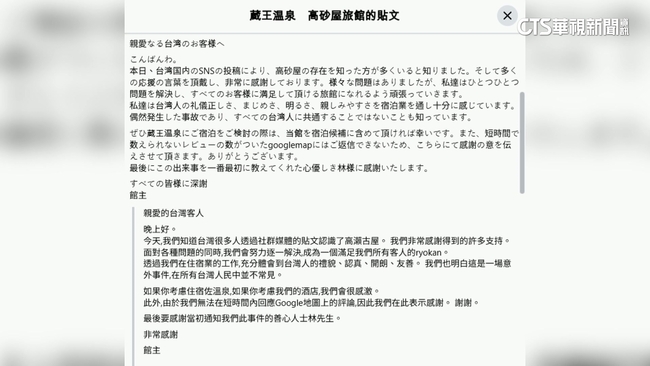 消息傳回台灣,大批網友直呼丟臉,紛紛湧入旅館的評論區給予5星好評「補血」。對此,旅館業者也特別發表公開信,暖心表示「明白這只是偶發意外」,更強調這不代表所有的台灣人,大度的回應感動無數網友。