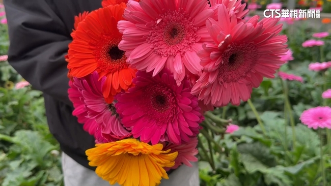 整片繽紛菊花海花況美不勝收,吸引不少遊客從各地來,花海當背景怎麼拍都美,還順道體驗採花樂趣,遊客說:「我想要拿去送給我女朋友,她說她很喜歡這種顏色的花。」
