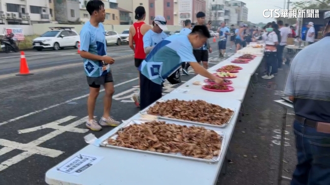 台南古都馬拉松,1日上午開跑,沿路滿滿美食超吸睛,香噴噴烤乳豬直接搬到現場,光是聞到香氣就口水直流,業者毫不手軟,提供超大肥美的龍蝦,就是要替跑者們加油打氣。