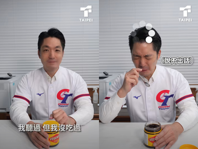 中華隊今日首戰對上澳洲,蔣萬安一早發出影片,可以看到他身穿中華隊球衣,要挑戰吃澳洲國民抹醬Vegemite維吉麥。蔣萬安先是聞了聞,並且緊皺眉頭,說「抹醬我以為是甜的,聞的感覺是鹹鹹的。」接著他試吃第一口,忍不住喊「好鹹喔」。