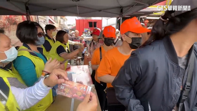 不僅旗山天后宮前陣頭隊伍鑼鼓喧天,在一旁,還排起人龍隊伍,原來是高雄市府經發局為了恭迎白沙屯媽祖,南下高雄旗山會香贊境,準備一萬份50元媽祖平安劵,給予信徒們在現場消費折抵使用,連帶讓周遭店家業者樂開懷。