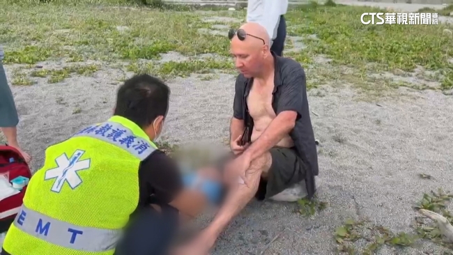 義消在岸邊,替一名外籍男子擦藥包紮,可以發現他的右腿有明顯傷口,但在海邊受傷,不是因為看海或衝浪,而是剛英勇救人,MLB堪薩斯皇家球探Nathan D. Miller說:「我就是來這裡,散步一下啦,在我看那個女生,她...我看她,覺得她就要(發生意外),在...她沒辦法回來(岸邊),所以要來幫她的忙啊。」