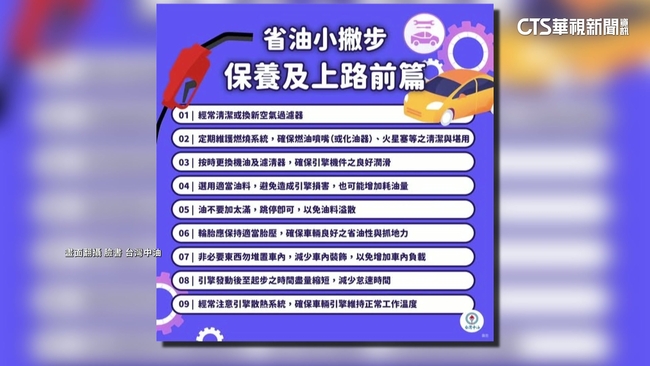 中油分享9個省油方法,首先要經常清潔或更換空氣濾清器;第2是定期維護燃燒系統;第3為按時更換機油及濾清器,第4是選用適合的汽油;第5加油時不要加滿,加至油槍跳停即可;第6保持輪胎胎壓正確;第7為降低車輛負重,第8要縮短怠速時間;最後是定期檢查引擎散熱系統。