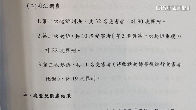 台中市議員(民)張家銨:「局長掌握的卻只有43人,其他的孩子呢,其他的孩子不需要諮商,不需要輔導,不需要後續的諮商引進嗎。」面對質疑台中市長盧秀燕,親上火線澄清,案件進入司法調查,但在第一波以及第二波起訴,受害學童有重複,因此確切受害人數量還有待釐清。