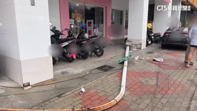黑轎車突然失控,開到對向車道,接著逆向衝上人行道,還撞到停路邊的兩輛車,其中一輛還被撞出停車格,現場一片凌亂,肇事的黑轎車橫在人行道上,車頭跟車身凹陷變形,被波及的兩輛車,車頭部分毀損,還有一座燈桿,被撞得連根拔起,整根倒下後,又擊中旁邊的美妝賣場,導致整面的玻璃大門碎裂,肇事的黑轎車駕駛,還一臉驚魂未定。