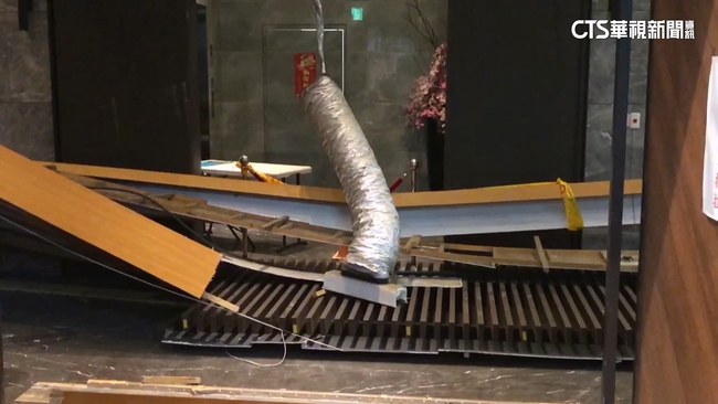 凌晨12點半大樓一樓大廳大面積裝潢木材、鐵片,應生砸在沙發區,民眾:「如果有坐人就完了。」幸好當時沙發沒人,不過超大片裝潢木板連帶上面鐵片,從天花板牆面脫落,不只砸在沙發區,管理員櫃檯也遭殃,整個大廳滿目瘡痍,前面管線、電線,通通外露,現場緊急拉起封鎖線,隨後警消也來到現場,查看有無人員受傷受困。