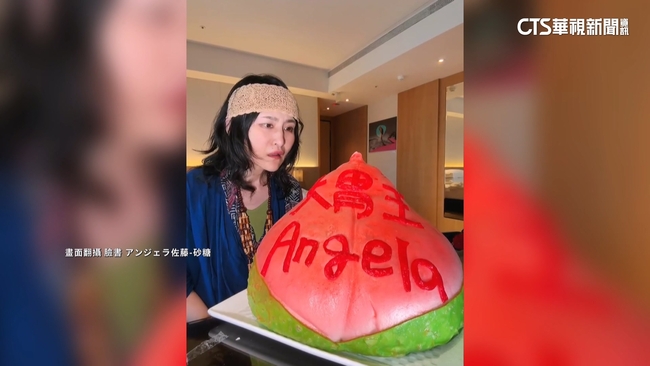 從畫面中可以看到,大胃王Angela佐藤在飯店房間內,看著桌上出現一顆超巨大的壽桃歡迎她,上面還寫下她的名字,這讓Angela佐藤一度懷疑自己是不是變成整人節目的主角。實際上日前她在台灣的吃到飽餐廳用餐時,才被其他顧客搶著付餐費,這讓她對台灣留下美好印象。