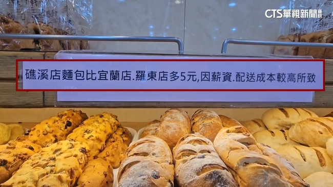 熱騰騰的烘焙香氣撲鼻而來,各式各樣的麵包放在檯面上,讓人看了忍不住口水直流,這裡是宜蘭知名麵包店奕順軒,不過近日卻被網友發現,想買礁溪分店的麵包,要多掏一點錢,貼紙,展示架貼著長長紙條清楚寫下,因為薪資和配送成本比較高,所以礁溪店裡的麵包,比另外兩間分店貴5元,分店價格差異也引發民眾討論。