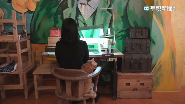 踩著裁縫車專心織布的李彩美老師,背後還有一隻可愛的喵咪陪伴。李彩美雖然本業是音樂老師,但對於拼布裁縫也相當拿手,現在更是藉由拼布作品的義賣,幫助許多流浪動物。