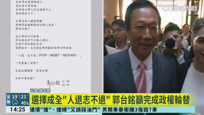 鴻海創辦人郭台銘稍早在臉書發文,他表示成大事者不計毀譽,為中華民國的未來選擇成全 ,人退志不退,並喊話定要政權輪替,改變台灣。至於賴佩霞也在臉書發文,證實2024年,我們不會出現在選票上了,也表示今日這個暫停,正是為了繼續與大家並肩同行。