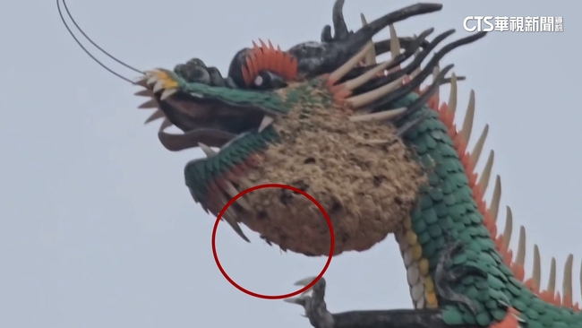 古意盎然精緻剪粘,廟宇上的兩隻祥龍,仔細看,左邊和右邊的,怎麼長得不太一樣,其中一隻祥龍頭部下方,多出一顆,如籃球般大的的黃色物體,遊客發現好訝異,記者VS.台南孔廟遊客說:「(會不會覺得有點危險)盡早拆盡早拆,(訝異嗎)當然會啊。」記者VS.台南孔廟遊客說:「第一次看到那可能看細一點會發現,(他結這麼大應該也要一段時間),這個應該是有一段時間,對。」