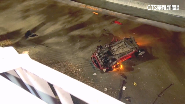 紅色轎車高速通過路口後,到了彎道仍然沒有減速,衝上人行道撞斷護欄,墜落大排,附近大樓保全說:「砰一聲很大聲,出來看,就沒看到東西啊。」當時是凌晨4點多,附近大樓保全聽到聲音,出來沒發現異狀,事後來發現原來紅色轎車,已經摔落大排,整台車幾乎全毀,駕駛意識清楚,但渾身擦傷肋骨骨折,被消防隊吊掛上來送醫急救。