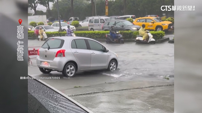 記者VS.民眾說:「(出入都很不方便對不對)對。」民眾說:「應該是有快,小颱風的感覺。」就在昨(13)日西南風來襲,也讓高雄一早降下大雷雨,風強雨驟下,多地也出現積水情形,大寮區民華街水淹民眾小腿肚之外,在仁武更是水淹半個輪胎高,車道積水宛如河流般,駕駛放慢車速行駛,同樣情形鏡頭來到左營翠華路,駕駛行駛過程濺起混濁泥水,車輛猶如海陸兩用車,在一片積水中奮力行駛。