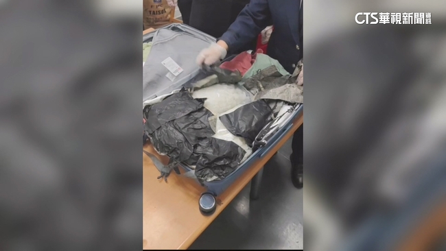 打開藍色行李箱,好幾件衣服旁邊,黑色大塑膠袋顯得相當突兀,裡面白色塊狀物,就是第三級毒品愷他命,另一個行李箱也是相同情況,航警局4月9日,在桃機二航廈發現一名加拿大籍的旅客,托運行李有異狀,開箱檢驗數十公斤的毒品,就這樣映入眼簾。