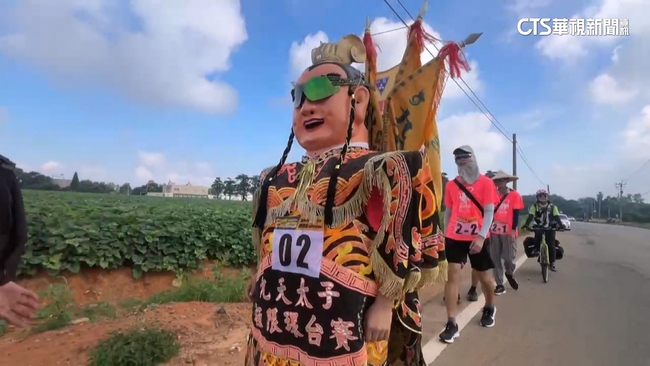 選手們輪流,扛著10公斤的三太子神偶,非常悶熱,斗大汗珠,從臉上不斷滑落,台中氣溫一早來到35度,體感溫度直逼40度,考驗選手耐力和體力,選手說:「是有點熱,但是可以順便遮陽,所以是還好。」