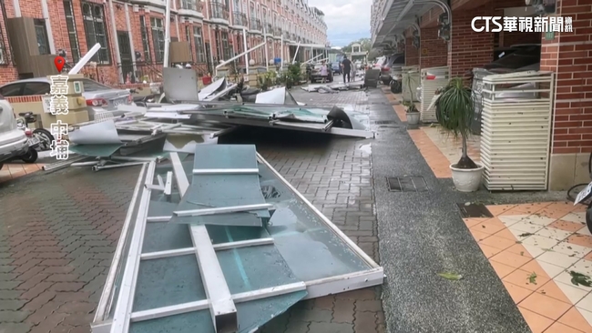 記者游育驊說:「可以看到,現在記者後方,一整排將近十多戶的住家,這個遮陽棚都應聲斷裂。」民眾說:「真的很恐怖,看到(變成)這樣,颱風真的很恐怖。碎片都整個飛,我一直在這邊驚聲尖叫,因為我第一次看到,這麼可怕的景象。」