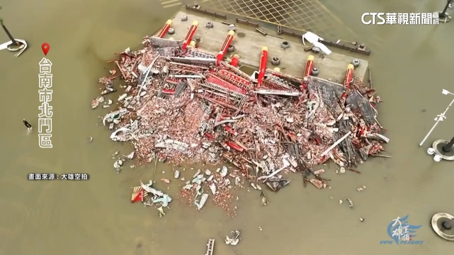 丹娜絲颱風重創南台灣,連台南知名的南鯤鯓代天府也災情慘重,從空中往下看,擁有40多年歷史的檜木牌樓,就這樣整個倒塌泡在水裡,上頭的磚瓦就像被推倒的骨牌完全粉碎,還有部分神像被颱風吹落,在積水中漂浮,而支撐牌樓的12根柱子,也跟底部基座徹底分離,全部斷裂。