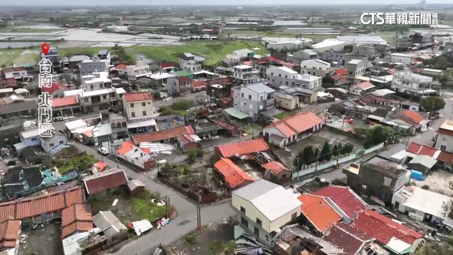 來到外面道路,好幾塊超長鐵條占據路面,而這些都是從天而降,因為民宅的鐵皮遮雨棚全部被吹毀了,華視新聞記者邱君萍說:「現在幾乎在這個蚵寮里內是沒水沒電,家家戶戶搬出躺椅,椅子,就是在門口就寢睡覺。」