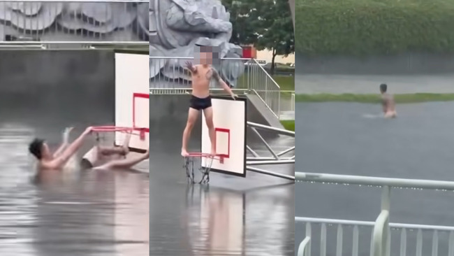 而彰化縣媒體記者協會也上傳多個角度的影片,只見男子還游到籃框,並爬上籃框,隨後又跳入池中。誇張行徑讓網友看傻眼,紛紛留言「不怕爛掉嗎…水超髒的欸」、「這髒髒水⋯⋯回去不會後悔嗎⋯」、「水很髒耶」、「雷打那麼大都不會怕的欸」、「水很髒耶,地上的狗大便及垃圾,旁邊的排水溝,全部混在雨水中」、「等等抗生素要打哪隻才有用」等。