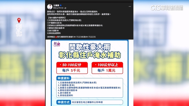 彰化連日大雨,鹿港、田中都是淹水重災區,縣長王惠美在臉書公布補助標準,如果淹水時拍下深度達50公分,每戶補助5千,100公分以上1萬元,但有民眾抨擊,淹水時都在忙著救災,根本沒空拿尺測量和拍照,還有民眾說,自己加水站只有淹20公分,但裡面的馬達都燒壞,一顆就要上萬元,鹿港老街的理事長也說,雖然幾乎每戶都被淹,但達到50公分以上的,只有一到兩戶,認為標準要放寬,縣府回應,會從寬從速來處理。
