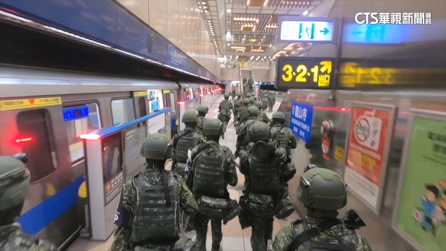 蹲在捷運座椅旁對著目標瞄準戒備,熟悉的捷運開門聲,車門一開憲兵從捷運車廂一擁而出出動了!你沒看錯,一整隊的憲兵走過燈火通明的宵夜豆漿店,深夜湧入捷運站進行地下機動,這也是國軍首度將大眾運輸系統,納入用兵規劃中。