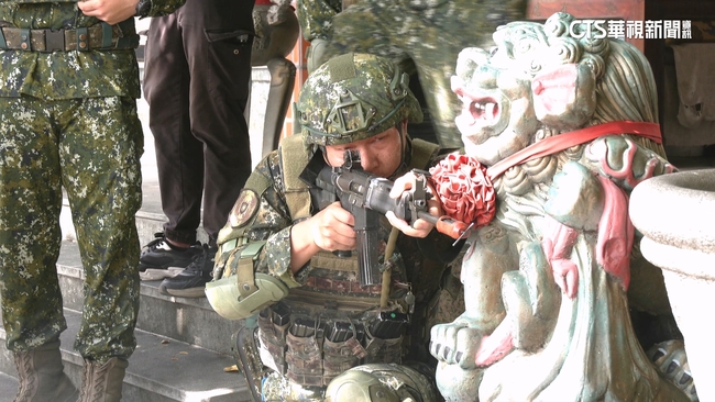 華視記者虞子煜說:「為了支援前線的士兵,勇虎戰車也架設在高台上,機槍兵隨時待命,要前線火力。」鎖定行進中的敵軍,機槍兵扣下板機開始掃射射擊,除了高空中有無人機進行監偵,掌握敵軍行進位置,周圍也有拖式飛彈車進入指定地點,執行飛彈射擊任務。